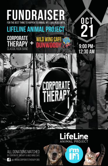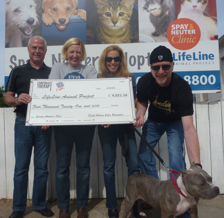 On Oct 21 2016, Corporate Therapy and Wild Wing Cafe Dunwoody help a Fundraiser for LifeLine Animal Project. Through you generosity we raised over $4,000 for animal welfare in Atlanta! Presenting the check to Karen Hirsch, PR Director and Heidi Gleason, Fundraising Mananger are Jim Brannigan, Owner of Wild Wing Cafe Dunwoody and David Holmes, keyboards for Corporate Therapy.